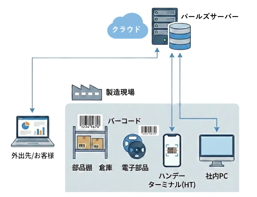 在庫管理システム「パールズ(Parls)」のシステムは、製造工場内にブロックごとバーコード貼られているに電子部品・リール部品の棚やケース、バーコード貼られている電子部品・リール部品、バーコードを読み込むためのAndroidハンディーターミナル、在庫の状況・履歴を確認するための社内PC、在庫の状況・履歴・BOM(部品表)を管理するWebベースのパールズサーバーから構成されています。 パールズサーバーはクラウド上で稼働しているため、外出先からも在庫の状況・履歴を確認することができます。